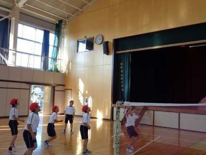 ネット型ゲームの学習です。ソフトバレーボールでラリーが続くと大盛り上がりです。