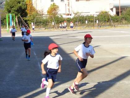 かけ足運動が始まりました。今年は大会は行いませんが、休み時間や体育の時間に持久力を高めていきます。同じペースで走り続けられるようにがんばります。