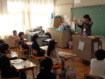 ペットボトルとびん、どちらの方がたくさん水が入るかな? 見た目だけでは分かりません。比べる方法を考えていました。