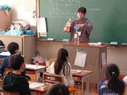 ペットボトルとびん、どちらの方がたくさん水が入るかな? 見た目だけでは分かりません。比べる方法を考えていました。