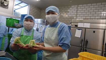 写真は、沼津産のカリフローレを手にした調理員さんです。