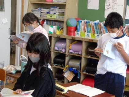 本気の音読中です。口をしっかり動かしてはっきりとスピーディーに読んでいます。文字を追う目が真剣です。