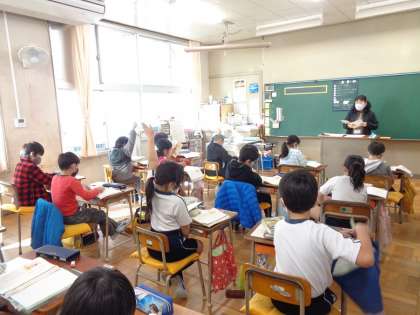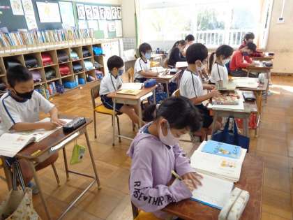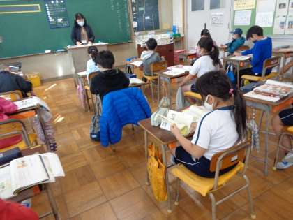本のポップを作ります。やる気満々でお気に入りの本を持ってきている子もいました。まずはポップを作る手順を確認しました。