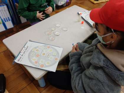 I want〜.の文を使って、オリジナルピザにのせたい物をもらいます。具がたっぷりのピザができあがりました。
