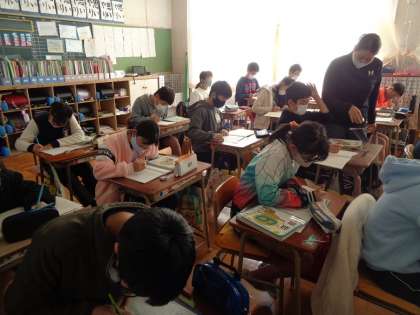 比例の学習をしています。二つの伴って変わる量の関係を表や式、グラフに表したり、比例の性質を用いて問題を解いたりしています。