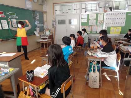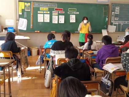 食べたものに含まれる栄養素が体内でどのような働きをするのか、栄養教諭にくわしく教えてもらいました。事前に調べたことと結びつけて質問をする姿も見られました。