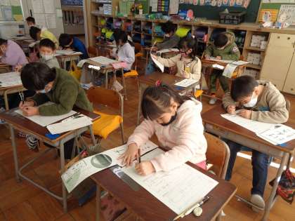 書き初めの練習をしています。フエルトペンで、とめ、はね、はらいに気をつけて「げんき」と書いていました。
