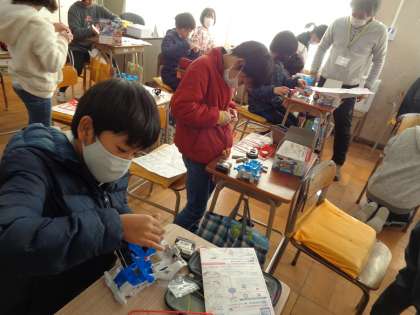 電磁石の働きを調べるために車を組み立てています。説明書を見ながら、がんばっています。なかなか難しいようです。