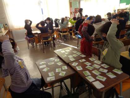47都道府県とその県庁所在地を覚えた4年生。県の形のカルタに挑戦です。県名を聞いて正しいカードが取れるかな?