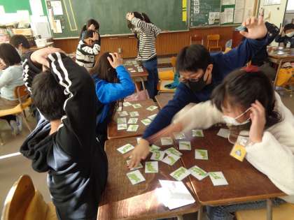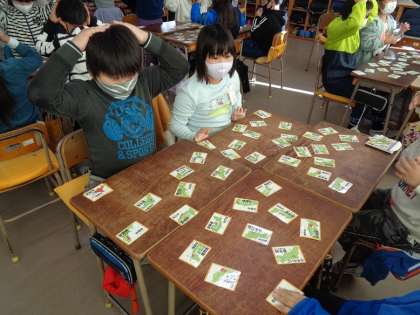 47都道府県とその県庁所在地を覚えた4年生。県の形のカルタに挑戦です。県名を聞いて正しいカードが取れるかな?