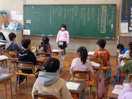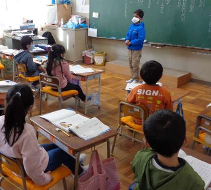 冬休みにしたことを順序を考えて友達に伝えています。みんなの前で話すのは緊張するけれど、しっかりと聞く人を見て話す姿が立派です。
