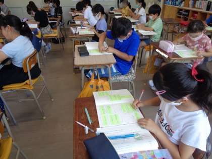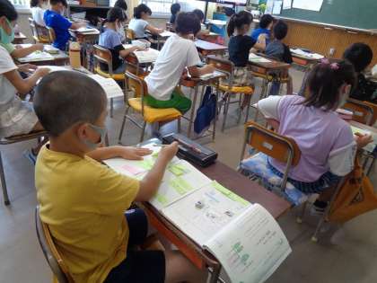 社会科見学で調べてきたことを新聞にまとめます。伝えたいことを付箋に書き出し、分類整理して記事の内容を決めていきます。
