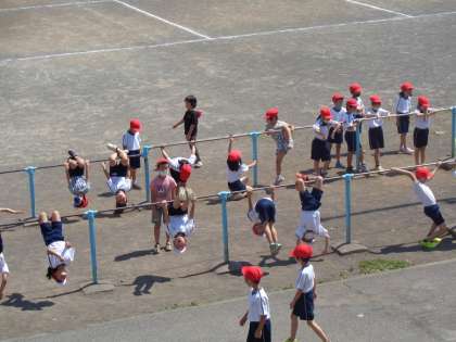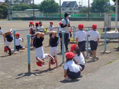 コウモリで逆さ感覚を養います。たくさん練習していろいろな技ができるようになるとよいですね。