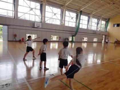 1組は、赤白帽子を使ってボール投げの腕の振りを練習していました。2組は、バスケットボールのパスの練習をしていました。