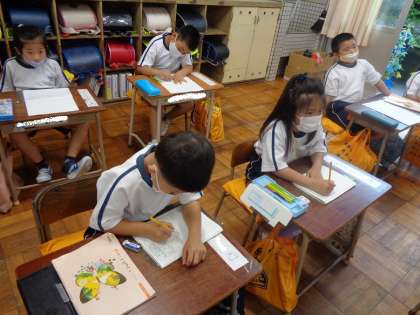 ひらがなを習ったばかりと思っていたら、もう、だれが、いつ、なにをして、どうだったかという文章を書く練習をしています。この数が月の1年生の成長はすごいです!