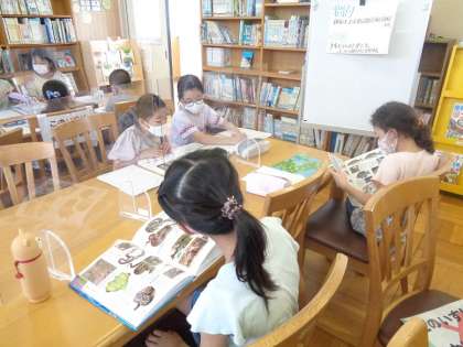 「魚→サメ→ジンベエザメ」のように、百科事典を使って、大きな言葉→中ぐらいの言葉→小さな言葉とつなげてテーマのもとになる言葉を決めました。その言葉について自分が興味をもったことをテーマにしました。例えば、「ジンベエザメはどれくらい大きくなるのか?」 今日は、そのテーマを解決するために、図鑑や本で調べて情報カードを作っています。