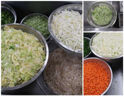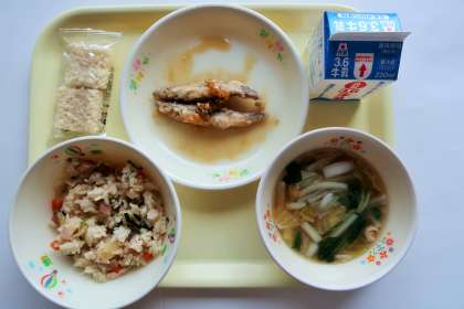 写真は、「中華風炊込みごはん」「ししゃもの南蛮漬け」「中華スープ」に使用した野菜です。沼津市では、9月に続き10月も配膳の過程を省略できる献立となっていますが、工夫をして、たくさんの食材を使って給食を作っています。