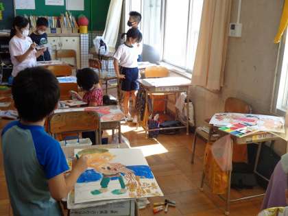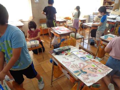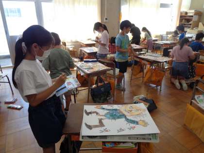 「ガリバー旅行記」を読んで心に浮かんできた場面を描いています。きれいな色を使って塗っています。