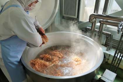 写真は、昆布鯖鰯削りでとった出汁に、香りのよい鰹削り節を最後に加えている様子です。