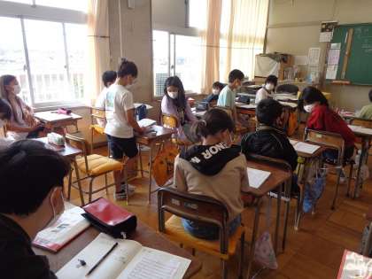 倍数、約数を学習した5年生。次に待ち受けるのは、分数の通分です。4年生で学習したことを確かめ合いながら進みます。