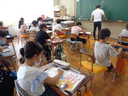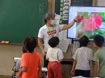 ホウセンカの育ち方をふり返っています。つぼみはどこ? ここだよ。大きなモニターに吸い寄せられる子供たち・・・。