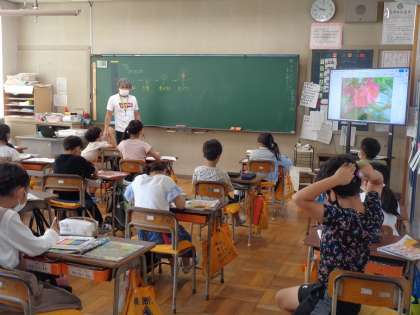 ホウセンカの育ち方をふり返っています。つぼみはどこ? ここだよ。大きなモニターに吸い寄せられる子供たち・・・。