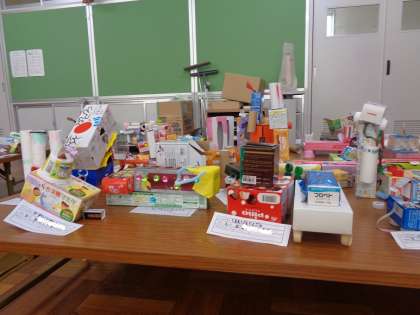 算数の「はこのかたち」の学習で使ったたくさんの箱を使って、図工で作りたい物を作りました。ロボット、動物・・・楽しい作品が並んでいます。