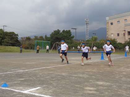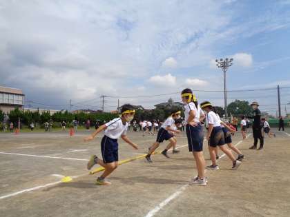 4時間目に4年生が学年運動会を行いました。団体競技は「台風の目」です。三人の息を合わせて棒を回すところがみどころです。
