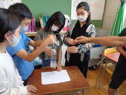 炭酸水に二酸化炭素が溶けているのかどうかを石灰水を使って調べました。炭酸水の泡が管を通って試験管に入ってくると石灰水が白く濁っていく様子を観察しました。