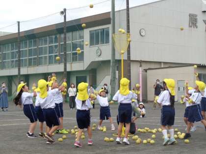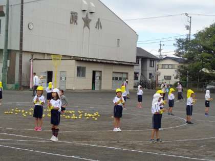 1年生の団体競技は玉入れです。かごを狙って投げる練習をしてきました。どのクラスもかごいっぱいに玉が入りました。