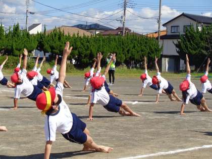 秋晴れの中、6年生が小学校生活最後の運動会を行いました。6年生は、組体操一人技を組み合わせた表現運動の後、メディシンボールで対決しました。表現運動は、さすが6年生、手足の指先までびしっと伸び、全体の動きが見事に揃い、見ていてすがすがしい気持ちになりました。メディシンボールは、校長先生曰く「今まで見た中で一番熱いメディシンボール」でした。