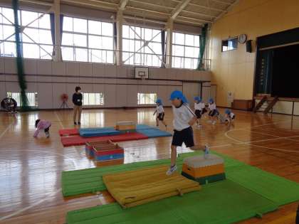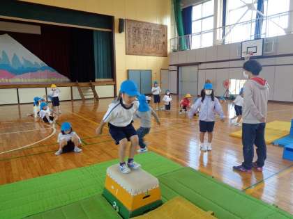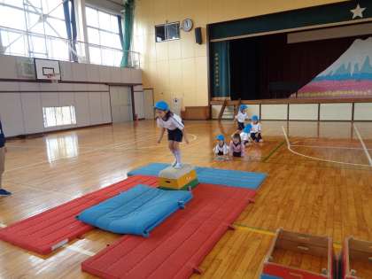 跳び箱遊びを楽しみました。しっかり踏み切ってジャンプして跳び箱の上に立てるかな?