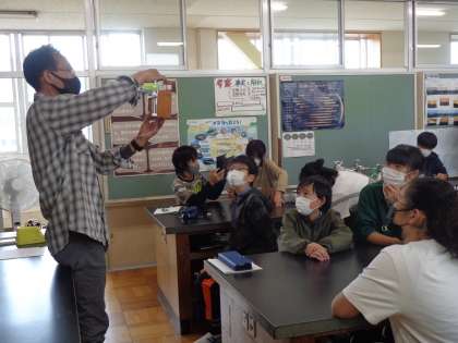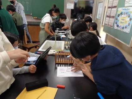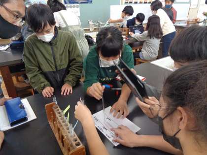 食塩水、炭酸水、アンモニア水、石灰水、塩酸の5種類の水溶液のリトマス紙の変化を確かめました。