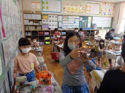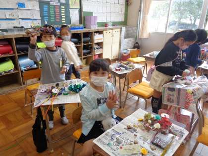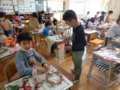 種から育てたアサガオのつるを使って、リースを作りました。いろいろな飾りを付けて、すてきなリースができあがりました。