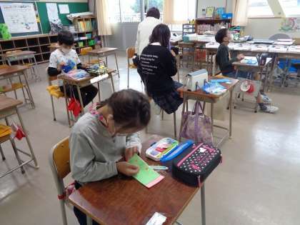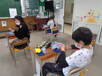 手縫いで小物作りに挑戦しています。波縫い、ボタンを付け、先生に教えてもらいながら、一生懸命進めました。