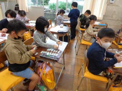 計算カードをばらばらにして、答えが同じものを選んで並べています。式を見てぱっと答えが頭に浮かぶくらいくり返し練習しておくとよいですね。