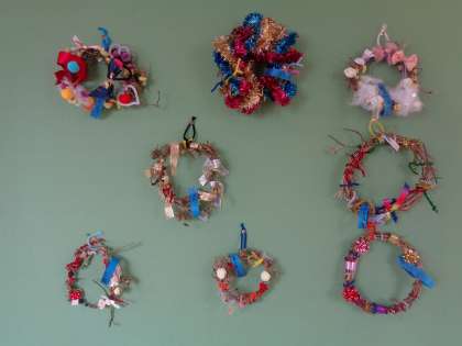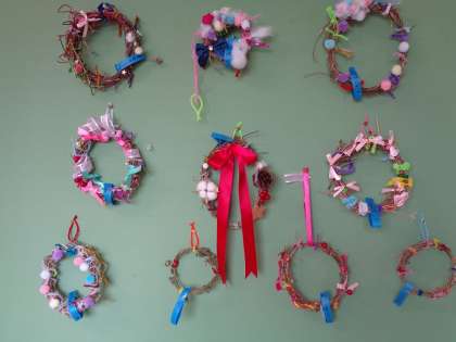 アサガオのつるを使って作ったリースが廊下に勢揃い! どの子のリースもすてきに完成しました。