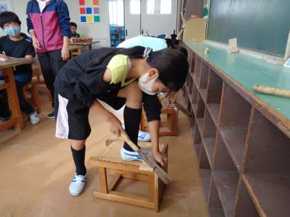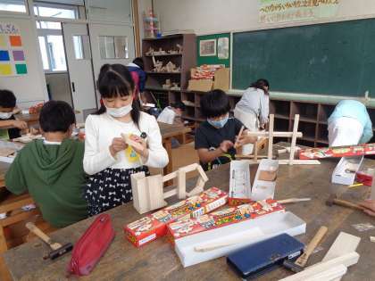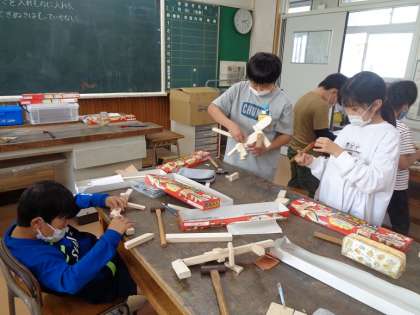 のこぎりの使い方も少し板に付いてきたようです。作りたいものが形になってきてうれしそう!