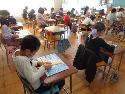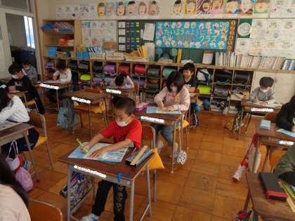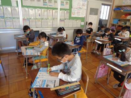 カッターナイフの使い方を練習しました。安全に上手に使って図工の作品作りをします。