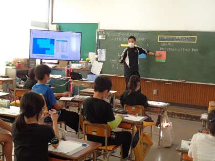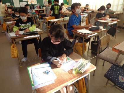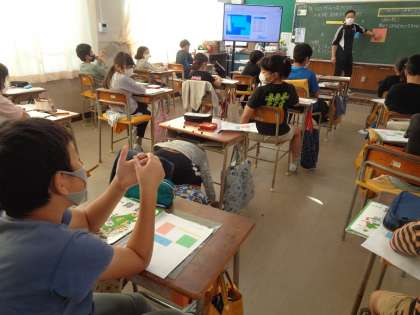 面積の学習に入りました。陣取りゲームでとりあった長方形のうちどれが一番広いのかな? 重ねて直接比較をしたり、ブロックいくつ分か調べたり、いろいろな方法で解決しました。