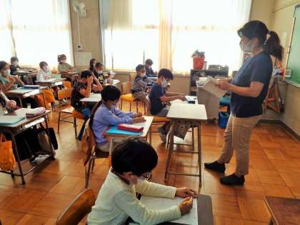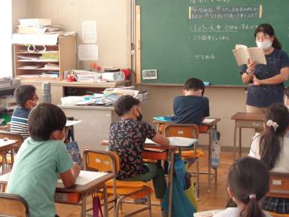 原の宝ってなんだろう? 「かなめいし」「おじか・めじか」のゆわれを先生が読んで聞かせてくれました。メモをとりながら聞いている子供たち、実際にその場所に行ってみたくなったようです。