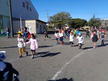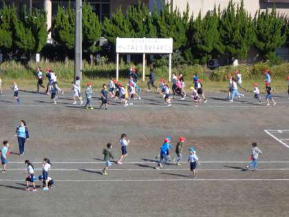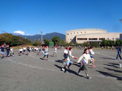 サンタイムの様子です。かけ足運動に取り組んでいる子がたくさんいます。すんだ青空、白い富士山を背に、一生懸命走り続ける子供たちの姿は、とてもすがすがしいです。