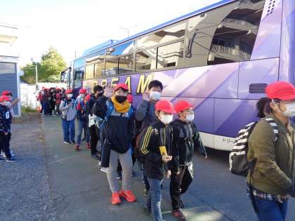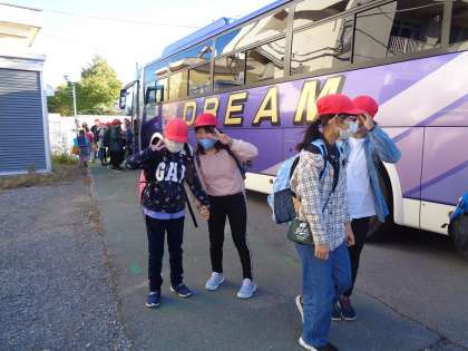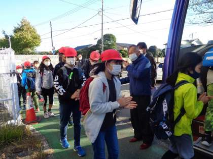 笑顔で出発! 活動の様子は、帰校後ホームページにアップします。
