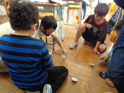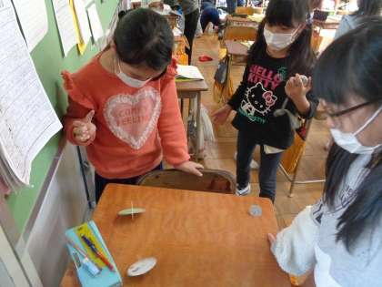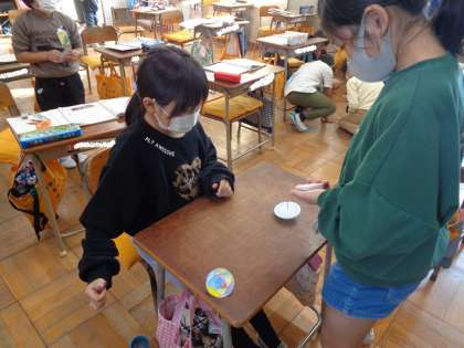 円について学習した3年生。コンパスできれいな円を描いて、中心に爪楊枝をさして、コマを作りました。誰のコマが長く回り続けるかストップウォッチで測っています。