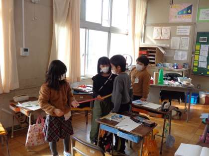 長さの学習です。友達の身長を紙テープでうつして、さて何センチかな? 今まで使ってきた30センチものさしでは当然足りません。みんなのものさしを使って、30センチが○ことあと何センチ。どうすればもっと早く測れるかな?