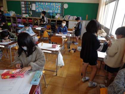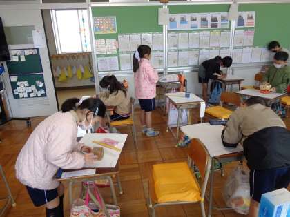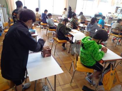 持ってきた箱の形をじっくり見て、面を写しとっています。面の数や面の形などに注目していきます。
