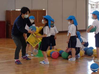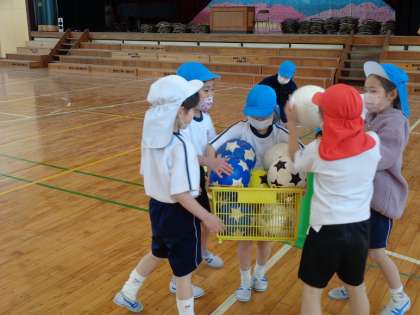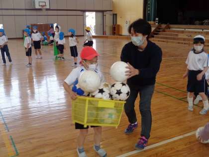 グループで協力してボール運びをしました。かごの中にできるだけたくさん入れて落とさないように運ぶのは大変です。