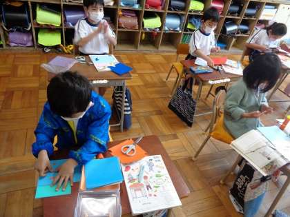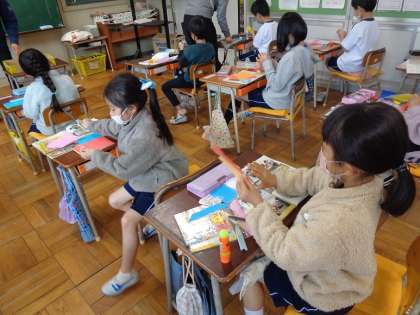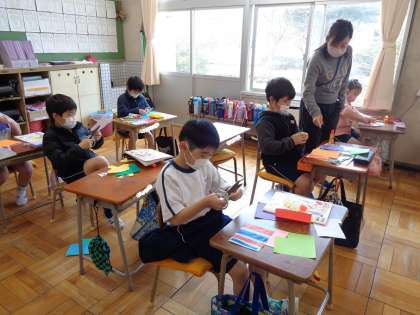 もうすぐ2年生! 入学してくる新1年生に渡す入学祝いのプレゼントを入れるバックを作っています。