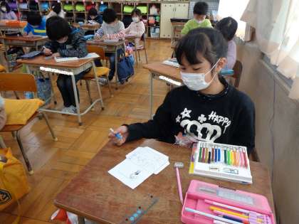 新一年生にアサガオの種のプレゼントをする準備です。種を入れる封筒にお手紙と絵をかきました。