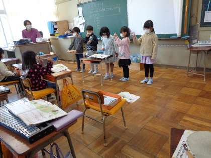 「こいぬのマーチ」の合奏を披露し合いました。友達の楽器の音をよく聞きながら演奏することができました。一つのグループの演奏が終わると自然によかったところを伝え合っていました。
